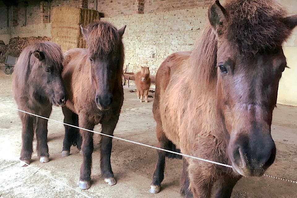 We hebben drie IJslanders en een mini-shet (héél mini op deze foto!) Ze leven in kuddeverband, buiten op een paddock-paradijs met royale weidegang. Ze hebben altijd toegang tot een open stal die in de zomer koel is en ‘s winters droog. Onder de kapschuur doen we ook coach-sessies bij nat of juist heet weer. Dierenwelzijn gaat bij ons voor alles.